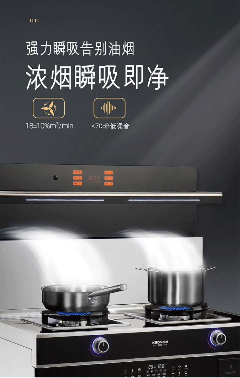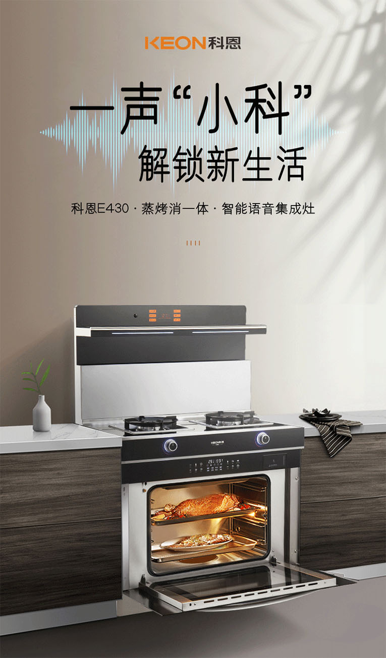 隨消費者對廚房油煙風險認識的提升,對于呼吸健康需求也得到了進一步的釋放,高效吸煙,隨心烹飪~科恩E430智能語音蒸烤消一體集成灶為消費者營造舒適烹飪環(huán)境,廚房油煙問題終將攻克,營造樂享智慧廚房新體驗!