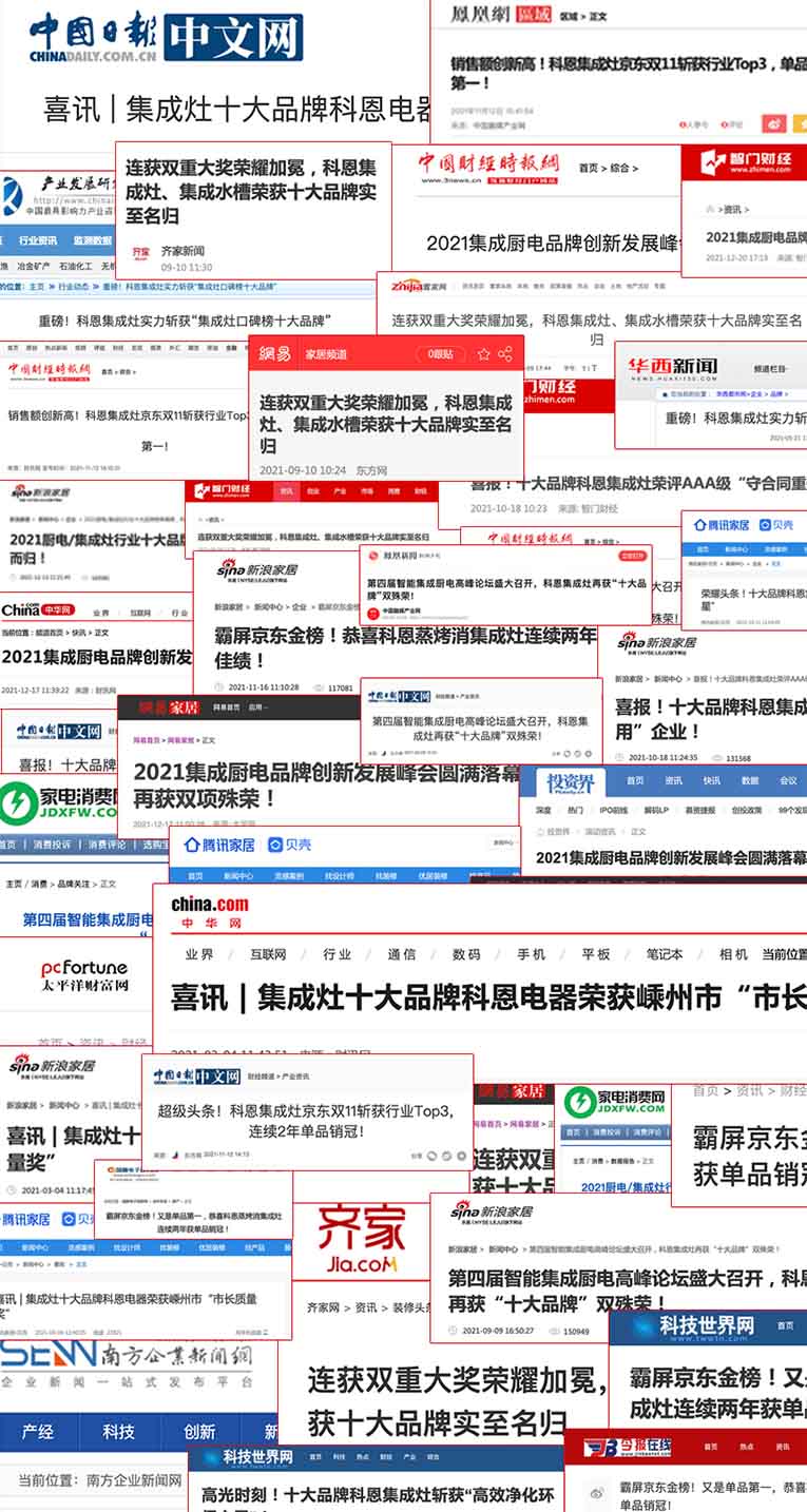 是榮譽(yù),更是責(zé)任,酒香不怕巷子深,科恩集成灶十二余年品牌沉淀,始終保持初心砥礪前行,得到越來越多用戶的認(rèn)可,備受市場、消費(fèi)者關(guān)注,百余家媒體爭相報(bào)道,為科恩高速發(fā)展做出了積極的貢獻(xiàn)。