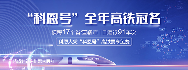 作為集成灶十大品牌、廚電行業十大品牌的科恩集成灶,杭紹臺高鐵的建成開通,開啟了科恩集成灶發展新篇章。2021年,斥資800萬,“科恩號”高鐵品牌專列馳騁大江南北,橫跨17個省/直轄市,日運行91車次。