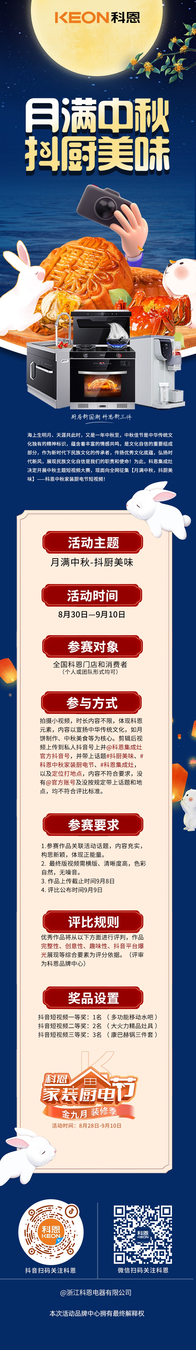 海上生明月、天涯共此時(shí),又是一年中秋至,中秋佳節(jié)是中華傳統(tǒng)文化獨(dú)有的精神標(biāo)識(shí),蘊(yùn)含著豐富的情感共鳴,是文化自信的重要組成部分,作為新時(shí)代下民族文化的傳承者,傳揚(yáng)優(yōu)秀文化底蘊(yùn),弘揚(yáng)時(shí)代新風(fēng),展現(xiàn)民族文化自信是我們的職責(zé)和使命!為此,科恩集成灶決定開展中秋美食節(jié)短視頻大賽,現(xiàn)面向全網(wǎng)征集【月滿中秋,抖廚美味】——科恩中秋家裝廚電節(jié)短視頻!