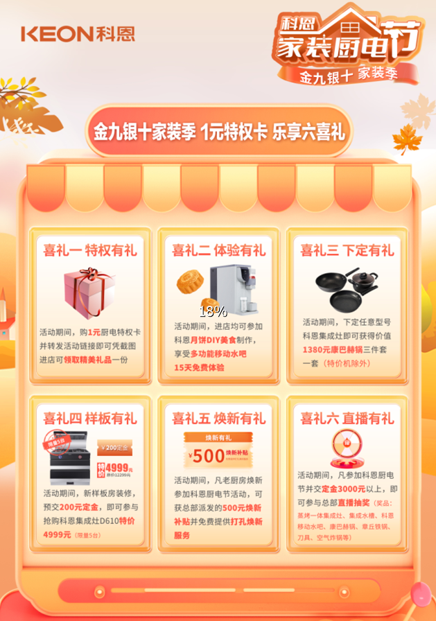 金九銀十科恩家裝廚電節(jié),1元特權(quán)卡,樂享六喜禮,還有超多精彩福利安排,這個(gè)假期等你來嗨!