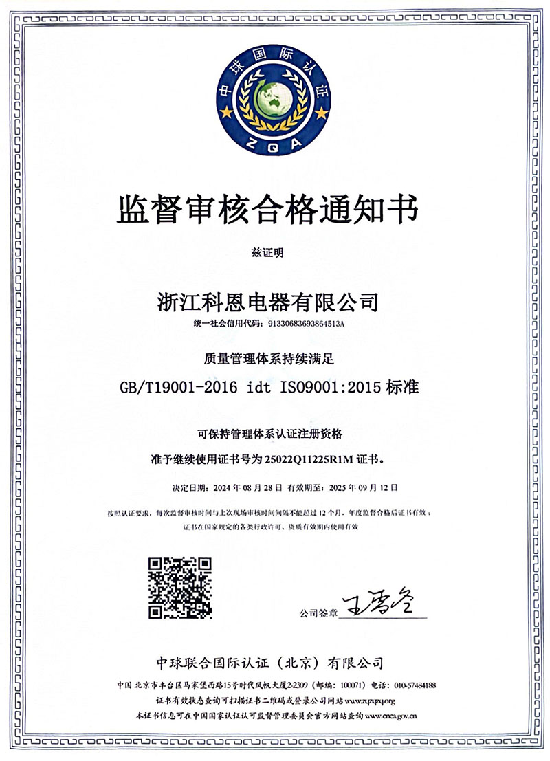 近日,浙江科恩電器有限公司經過嚴格審核,成功獲得了質量管理體系GB/T19001-2016ISO9001:2015)、環境管理體系GB/T45001-2020ISO45001:2018)以及職業健康安全管理體系GB/T24001-2016ISO14001:2015)的三項國際標準認證。