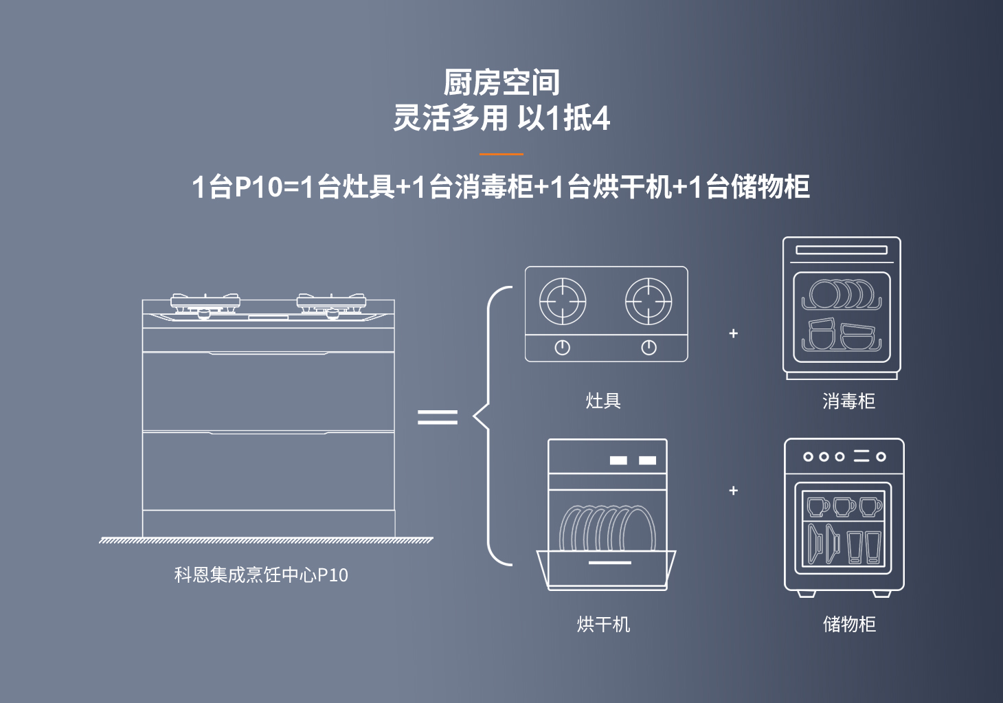 空間革命,小戶救星。告別傳統(tǒng)廚房束縛,解決刻板安裝限制。科恩新品集成烹飪中心p10,0.5個(gè)立方,化繁為簡(jiǎn)。空間釋放,不占櫥柜空間;主柜清爽,不積油免清洗,上烹下凈,立體空間全能集成。