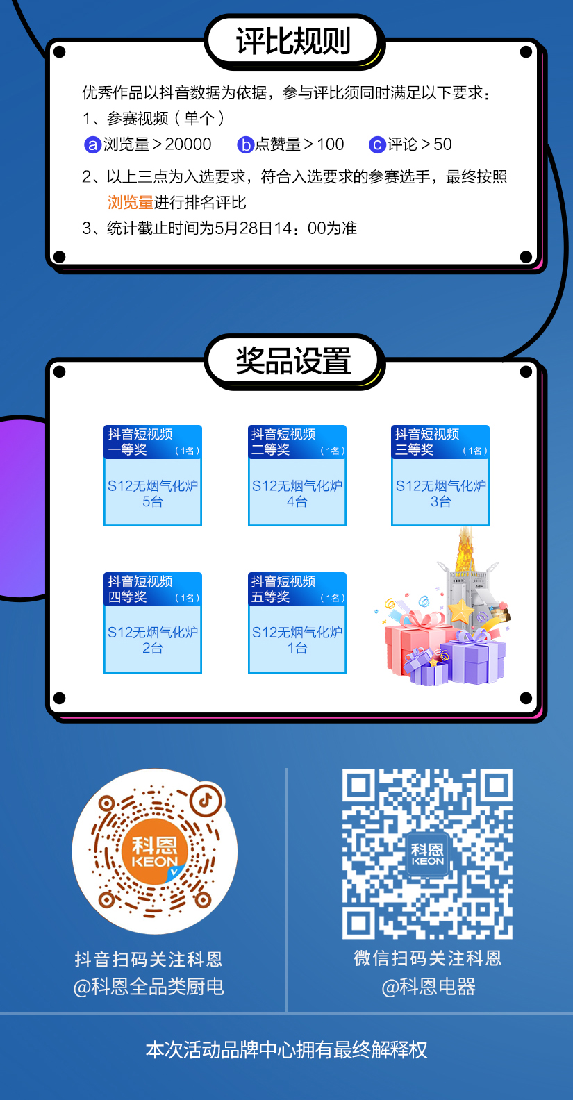 江湖風云起,爐火論英雄??焓詹剡@份規則秘籍。福利升級,獎品豐厚,煥新好禮帶回家。廚房江湖,等你來戰。@科恩全品類廚電官方抖音號,帶上話題 #科恩龍蝦節#科恩無煙氣化爐,定位打卡地點,即刻點燃爐火,舉起鏡頭,用一場色香味俱全的短視頻盛宴。搶占今夏流量C位!