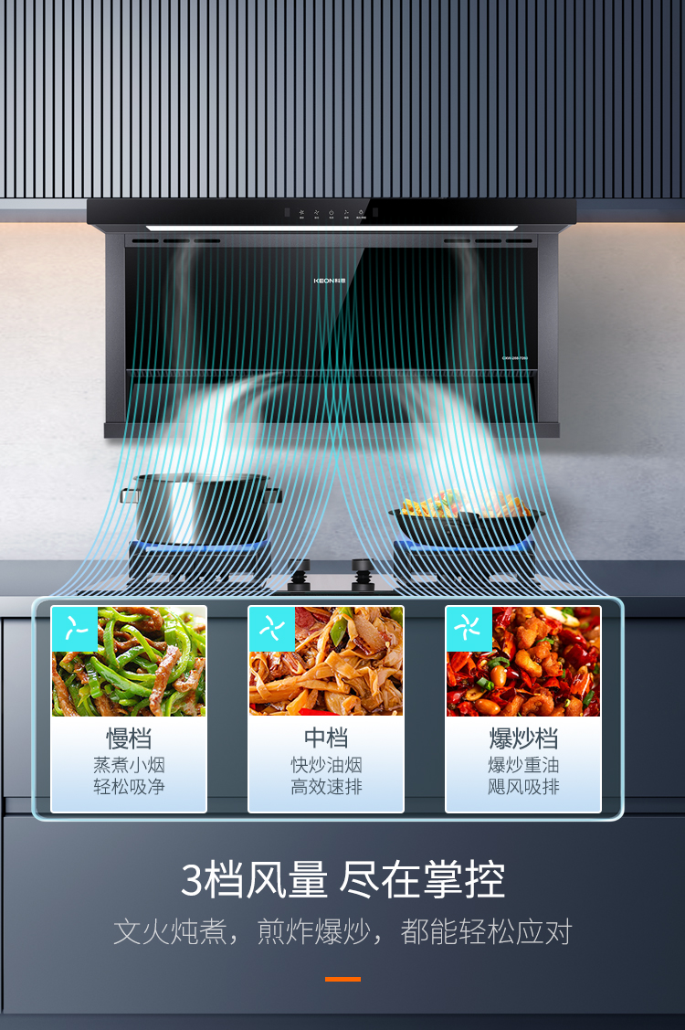 科恩7260煙機搭載頂側雙吸,形成立體龍卷風道,實現 1+1>2 的強力凈煙。颶風級吸力快速清場爆炒濃煙,3檔風量智能切換,多種烹飪方式都能輕輕駕馭,科恩7260煙機,守護廚房清新環境。