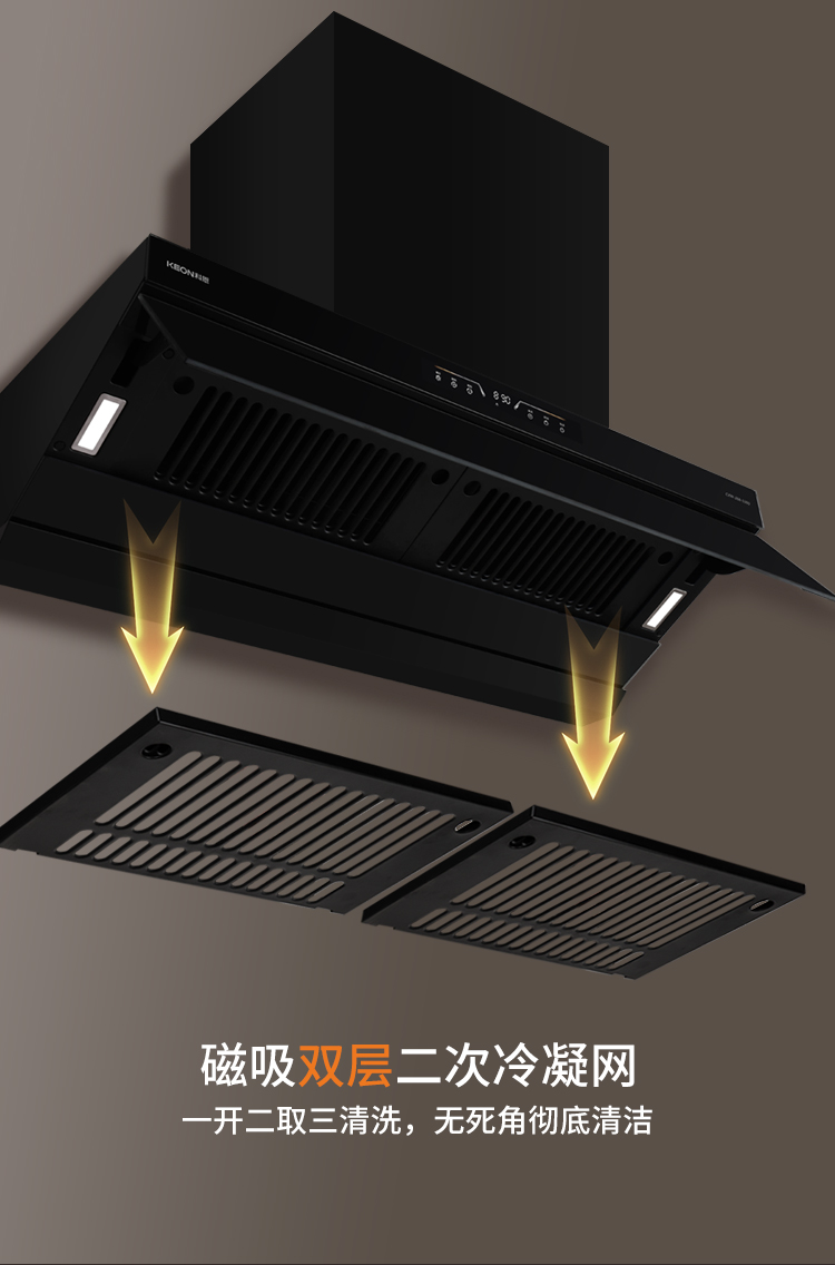 智控隨心潔凈無憂揮手即控無需觸碰,遠離油污沾染3+1檔精準控風,適配煲湯煎炒燉煮2min延時凈吸,殘余油煙一網打盡電熱自清潔快速溶解油污磁吸雙層二次冷凝網,油網一開即取,一抹即凈解放雙手,讓清潔如春風般輕松
