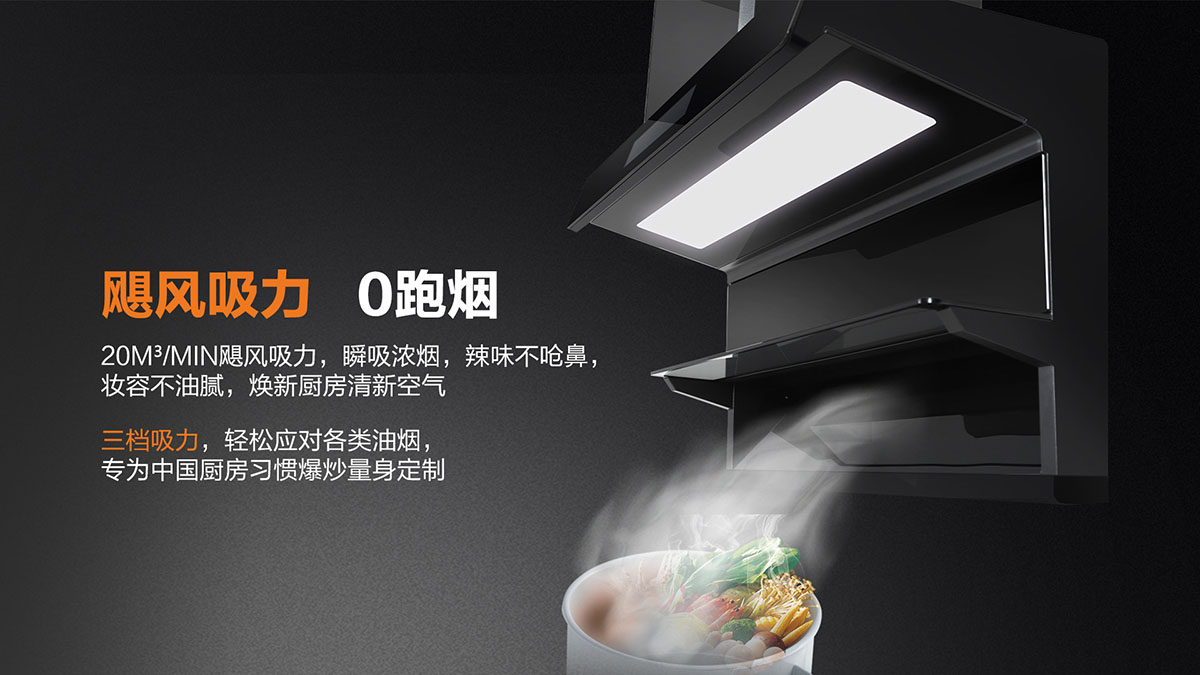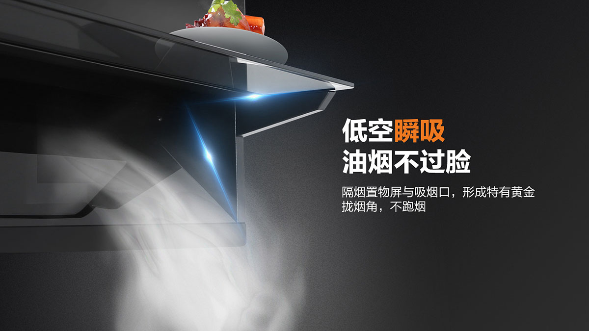 獨(dú)特黃金吸煙角,二次冷凝板內(nèi)傾設(shè)計(jì),油煙不過(guò)臉