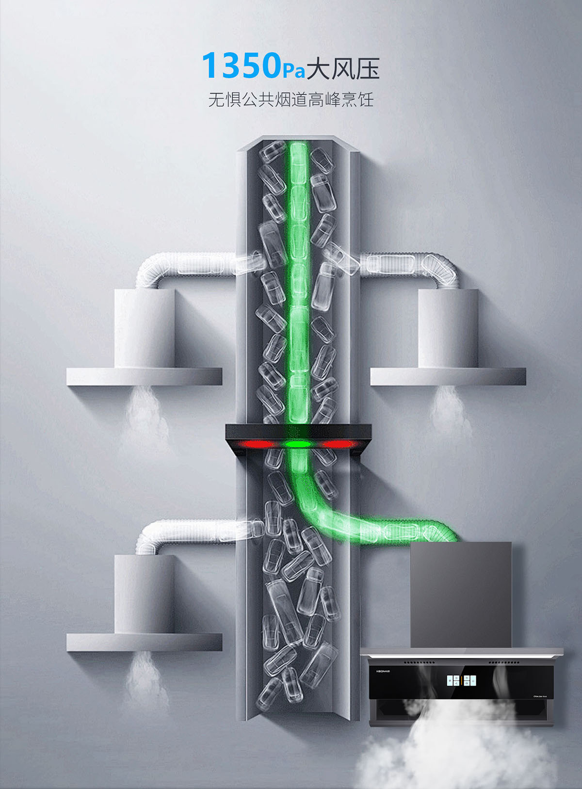 1350Pa大風壓,無懼公共煙道高峰烹飪